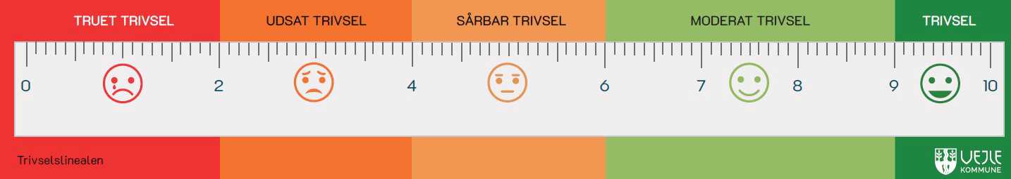 På trivselslinealen vurderes barnets/ den unges trivsel på en skala fra 0 til 10, hvor 0 er lav trivsel og 10 er høj trivsel.