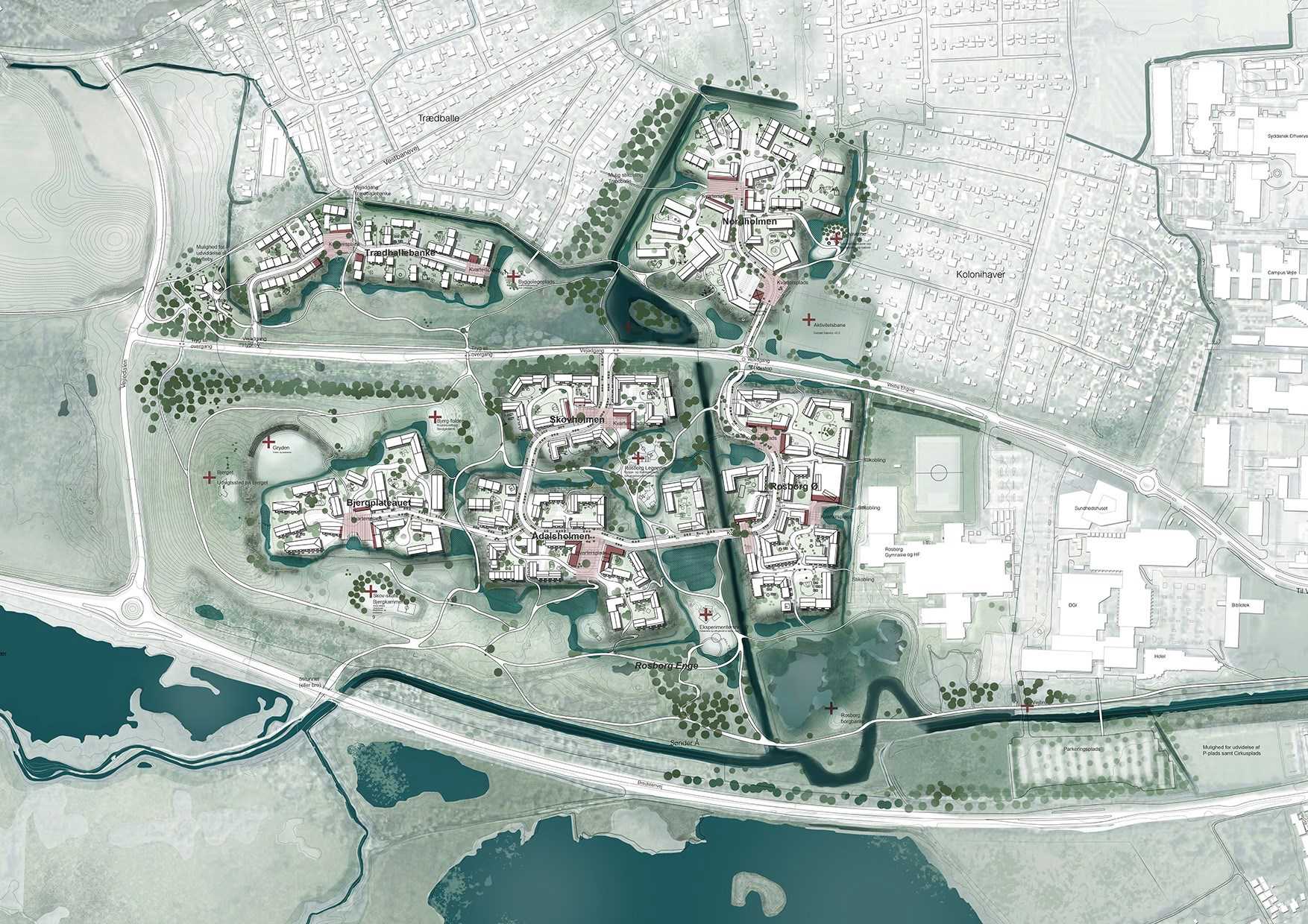 Situationsplan for Ny Rosborg - den nye bydel, der ligger sig tæt op ad naturen ved Vejle Å og Kongens Kær.