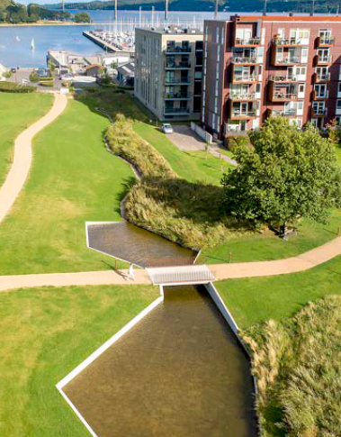 Med blågrøn strategi skaber vi forbindelser, hvor vi prioriterer naturen, vandet og det bæredygtige liv. Vi kalder dem blågrønne forbindelser, og de skal kombinere vandhåndtering i grønne rekreative områder og vil få en fremtræden rolle i forbindelse med udviklingen af vores byer og de nære omgivelser.