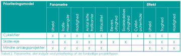 Prioriteringsmodellerne for henholdsvis mindre anlægsprojekter, cykelstier og skolevejsprojekter baserer sig på såkaldte multikriterieanalyser, hvor udvalgte hensyn (parametre) vægtes i forhold til hinanden ud fra forholdet mellem effekt og økonomi. Modellerne sikrer, at de projekter, der har den største effekt og de laveste omkostninger, prioriteres højest. Tabellerne nedenfor viser en oversigt over vægtning af parametre og hvilke parametre, der indgår i de tre modeller.