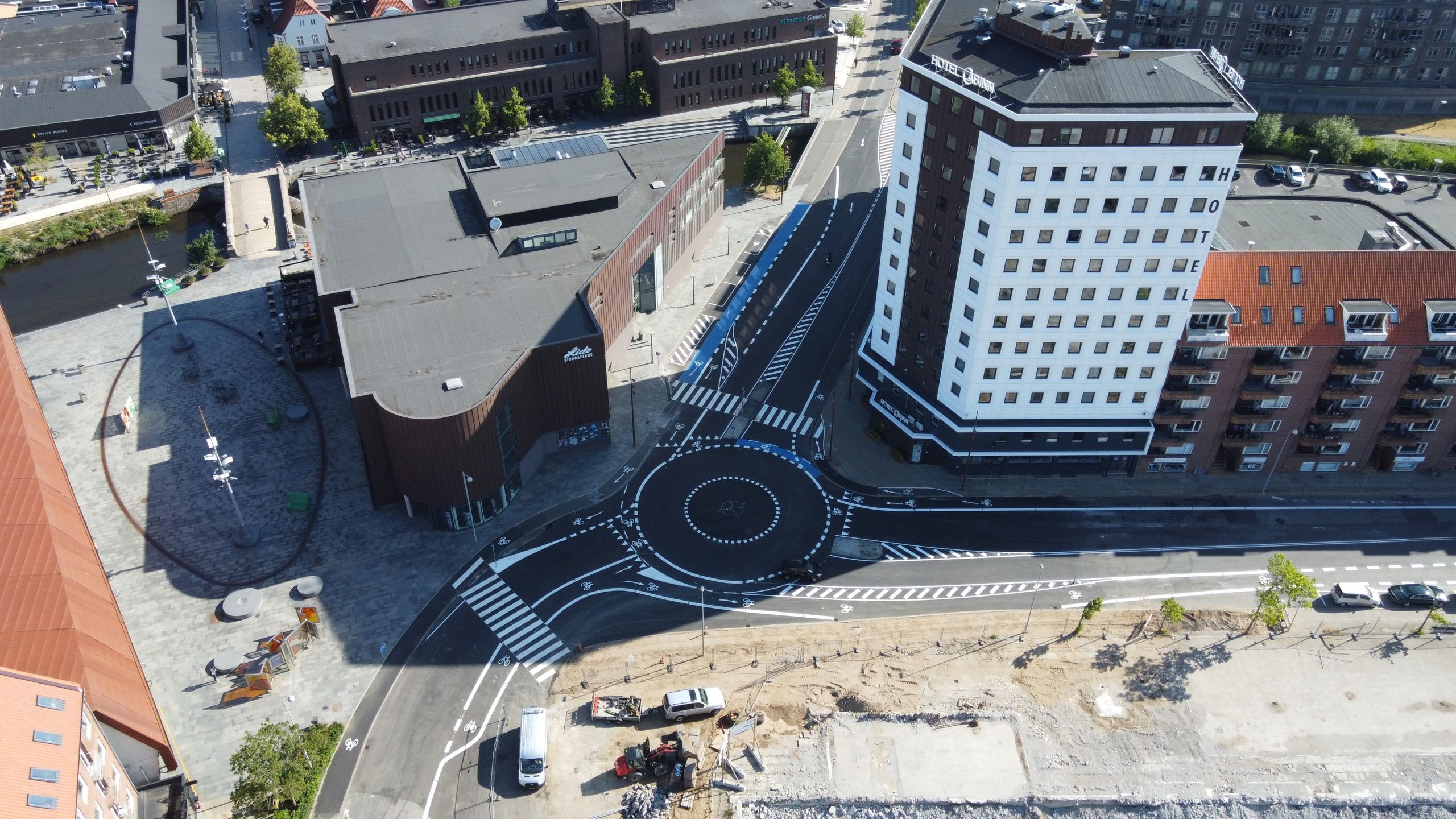 For enden af Sønderbrogade, ved Dæmningen og Gammelhavn, har vi etableret en midlertidig rundkørsel. Den skal gøre det mere sikkert og trygt for cyklister.