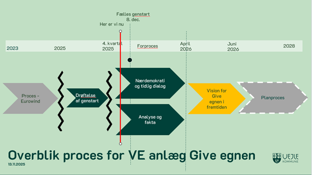 Projektet befinder sig lige nu i forprocessen - det vil sige i perioden, hvor ansøger (Eurowind Energy) er i gang med at udarbejde en ansøgning, og før den er sendt til den lokale myndighed (Vejle Kommune).