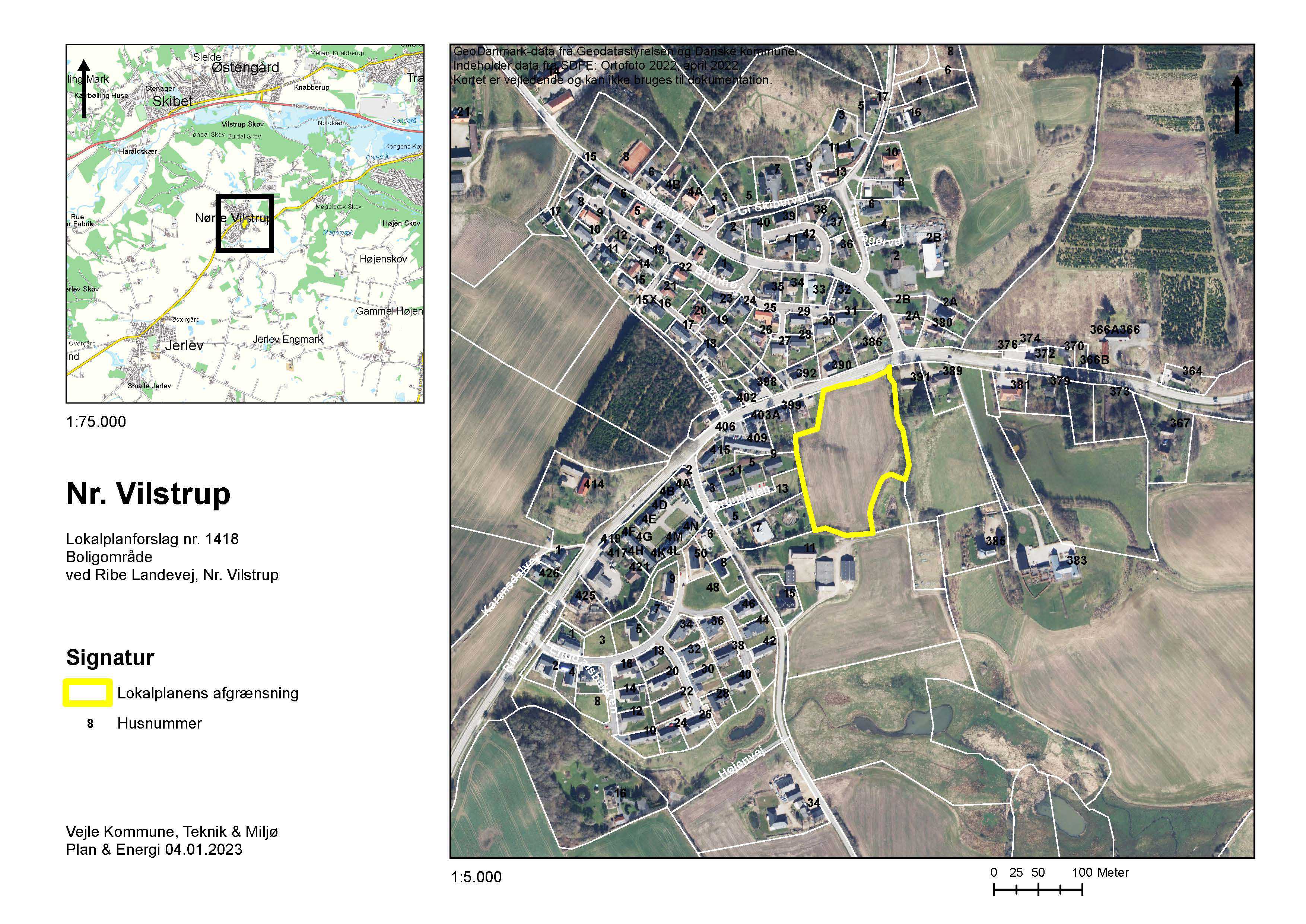 Byrådet har d. 20.11.2024 vedtaget lokalplan nr. 1418 Boligområde ved Ribe Landevej, Nr. Vilstrup. Efter offentliggørelsen af lokalplanen den 25.11.2024 må der ikke retligt eller faktisk etableres forhold i strid med planen.
