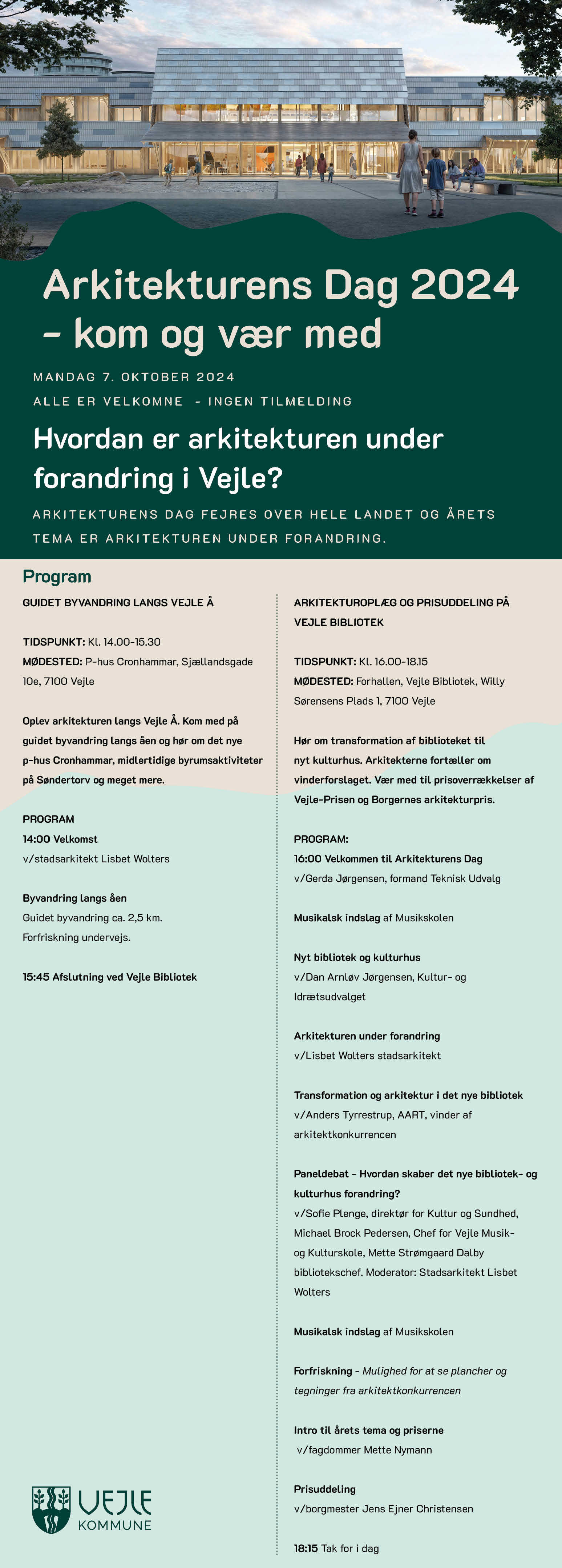 Kom og vær med til at fejre arkitekturen i Vejle Kommune mandag 7. oktober. I Vejle Kommune byder dagen på guidet byvandring langs Vejle å, arkitekturoplæg, musikalsk underholdning og dagen rundes af med afsløringen af vinderne af Vejle-Prisen og Borgernes Arkitekturpris.