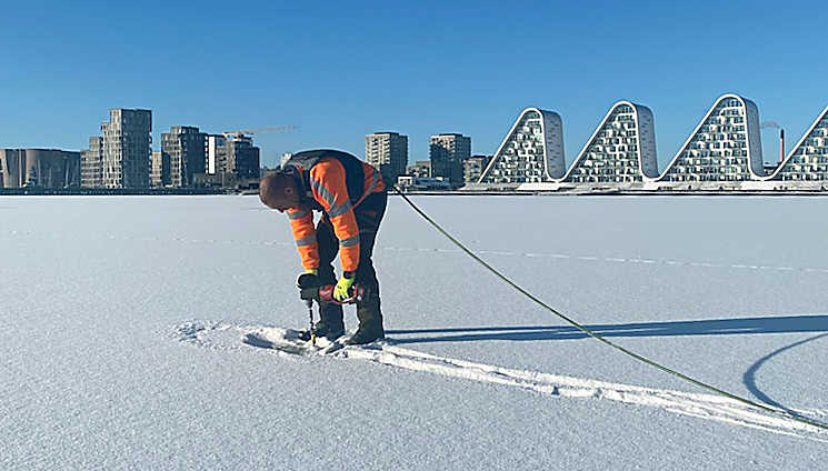 Når eller hvis vi får tykkere isdække og en længere, stabil periode med frost, måler vi isen dagligt på udvalgte søer og inderfjord. Hvis isen måles til mere end 13 cm tyk, opsætter vi tydelige skilte på de udvalgte steder, der viser, at isen nu er målt til over 13 cm.