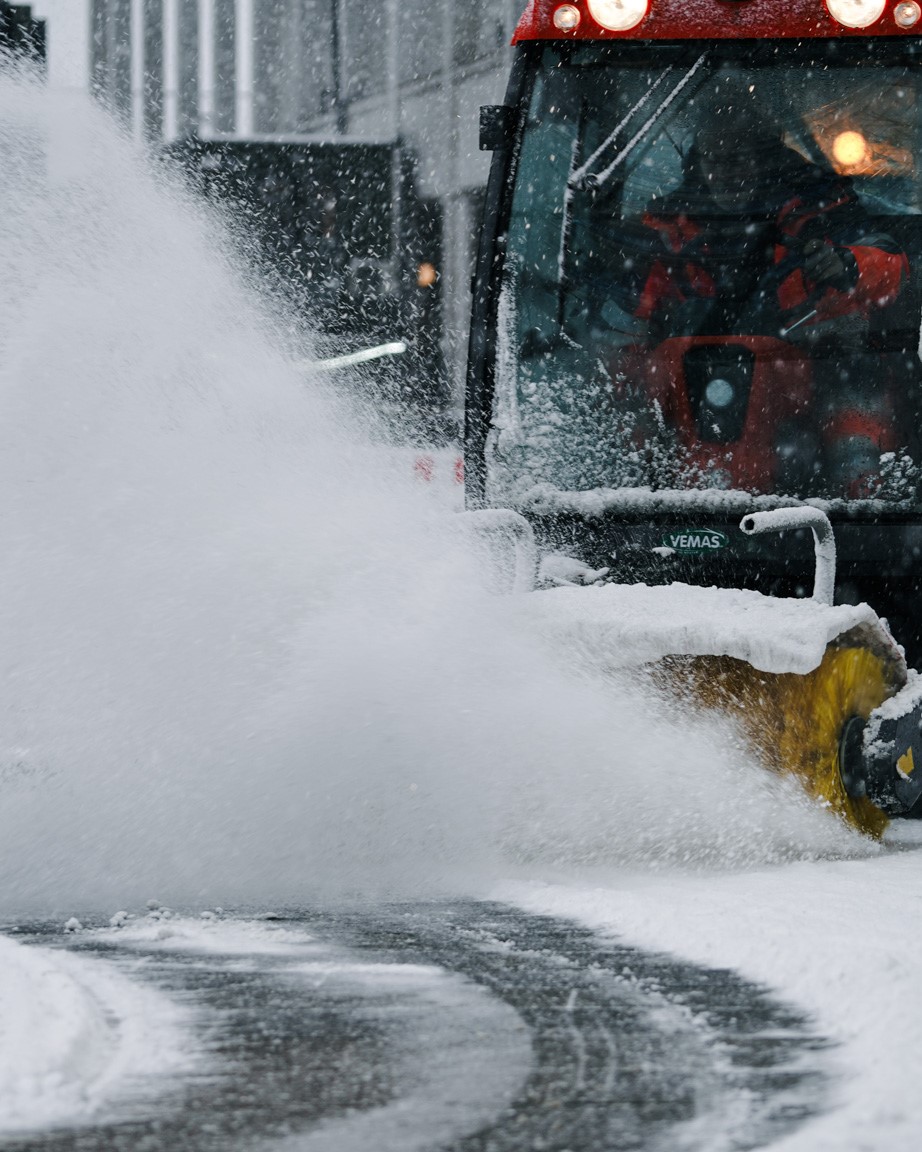 Vi har knap 80 maskiner i kamp mod sneen de her dage og derudover flere gående medarbejdere i manuelt arbejde, så vi gør, hvad vi kan for at dække: