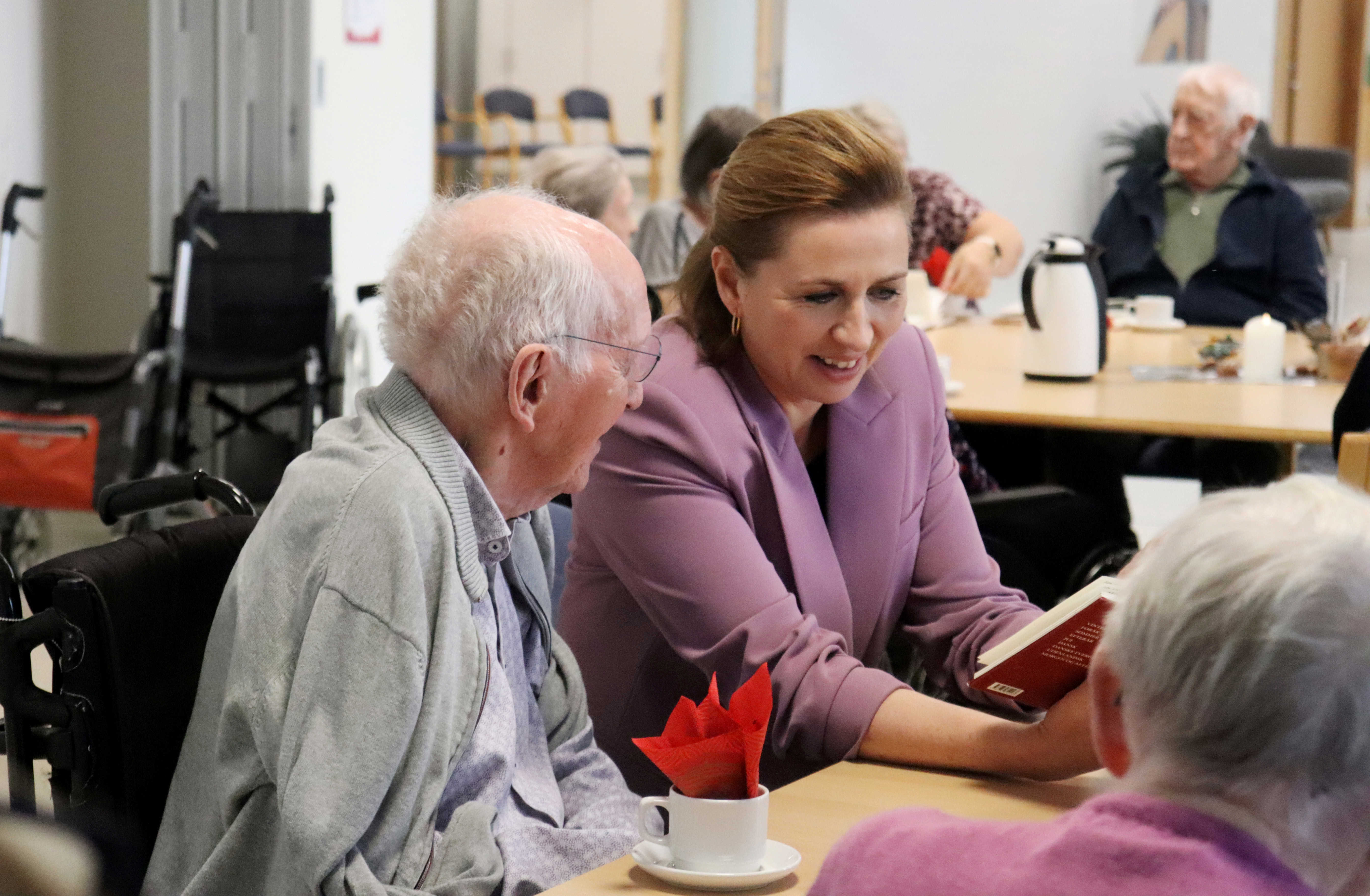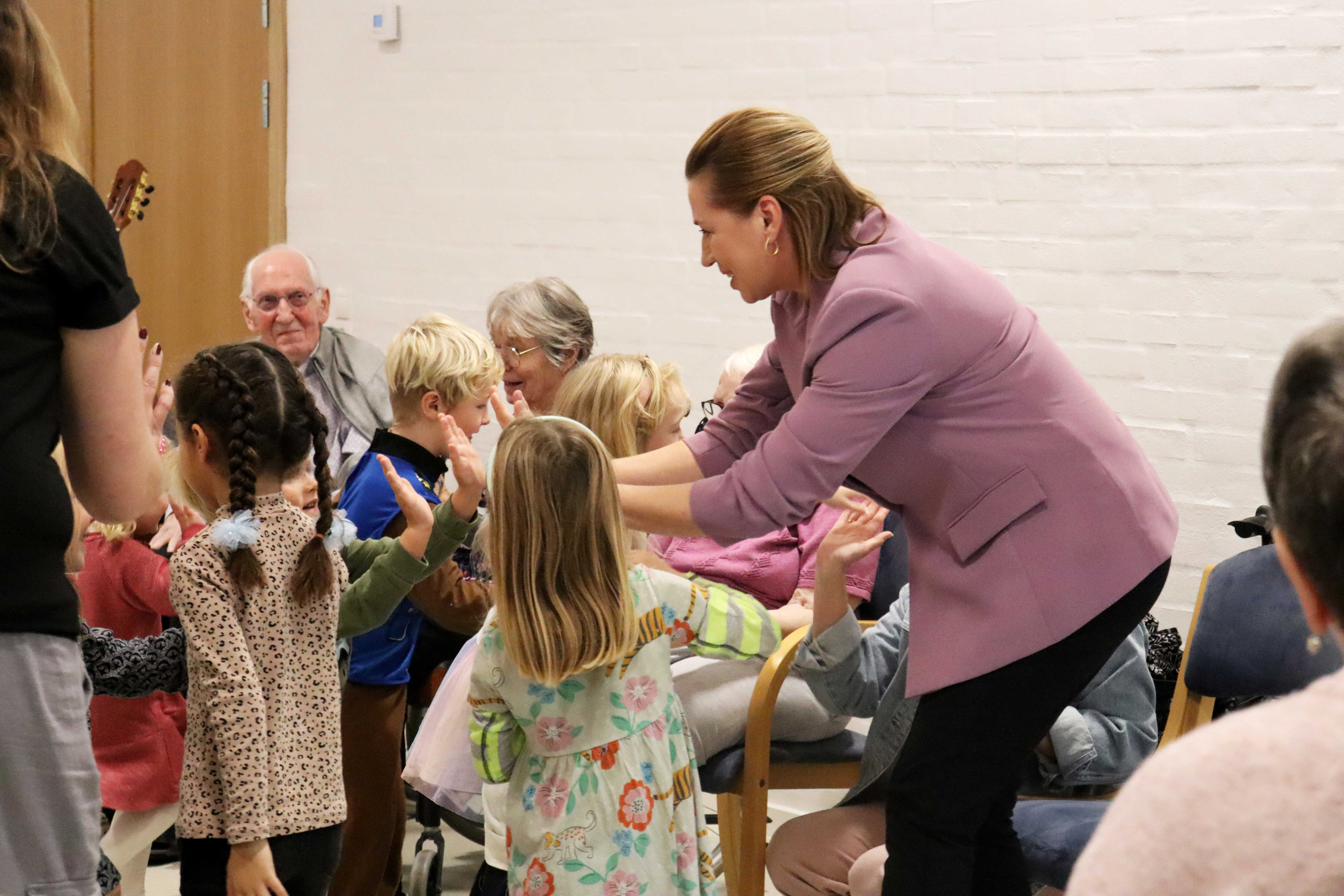 Rundturen startede med fællessang og dans i Kongesalen, hvor statsministeren modtog masser af danse-highfives fra de mange børn. Turen gik derefter videre til vuggestuen, hvor Bent, som ofte besøger børnene, sad klar til kram og hygge med de små. Besøget blev afsluttet i Gårdcaféen med sang, en hyggelig snak med plejecenterbeboeren Anne Marie – og selvfølgelig en god kop kaffe.