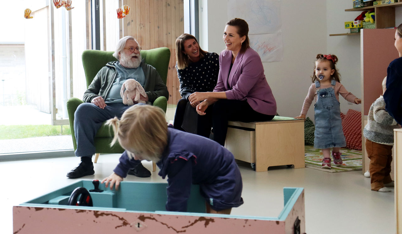 Det er ikke mere end et par måneder siden, at Kongeparret var på besøg på Kong Gauers Gård for at se institutionen, som er den første af sin slags i Danmark, hvor ældre bor side om side – og i samme hus – som vuggestue og børnehave holder til i. Og nu var det altså statsministerens tur.