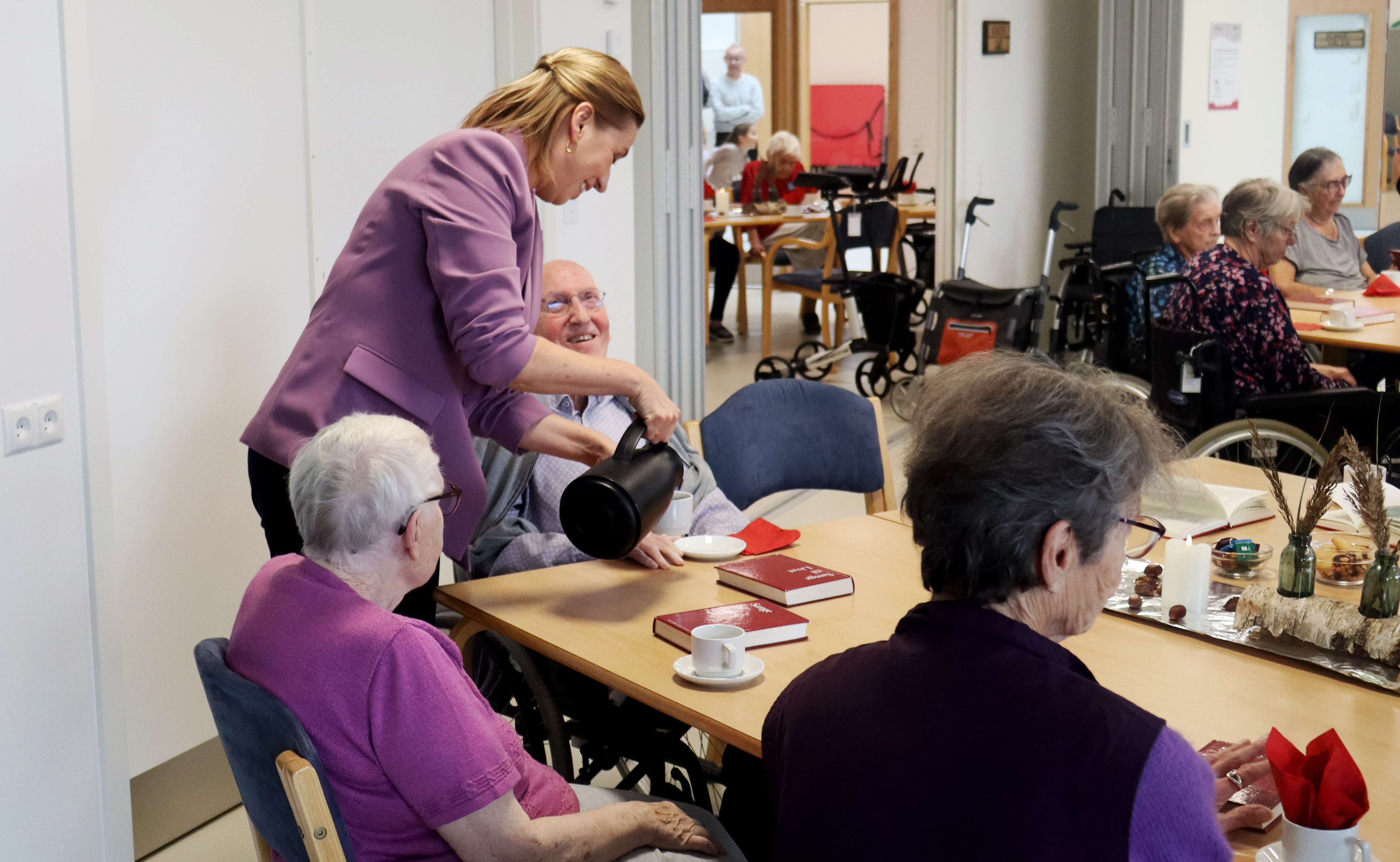 Rundturen startede med fællessang og dans i Kongesalen, hvor statsministeren modtog masser af danse-highfives fra de mange børn. Turen gik derefter videre til vuggestuen, hvor Bent, som ofte besøger børnene, sad klar til kram og hygge med de små. Besøget blev afsluttet i Gårdcaféen med sang, en hyggelig snak med plejecenterbeboeren Anne Marie – og selvfølgelig en god kop kaffe.