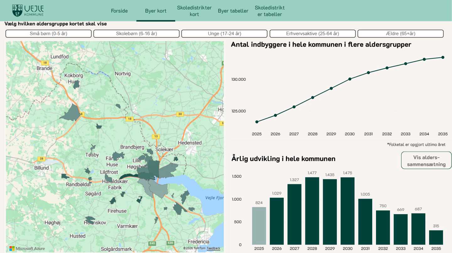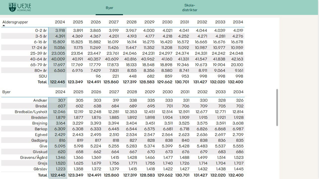 Du kan se befolkningsprognosen 2026-2035 opdelt på skoledistrikter og byniveau. Vælg selv, om du vil se prognosen grafisk eller som tabel.