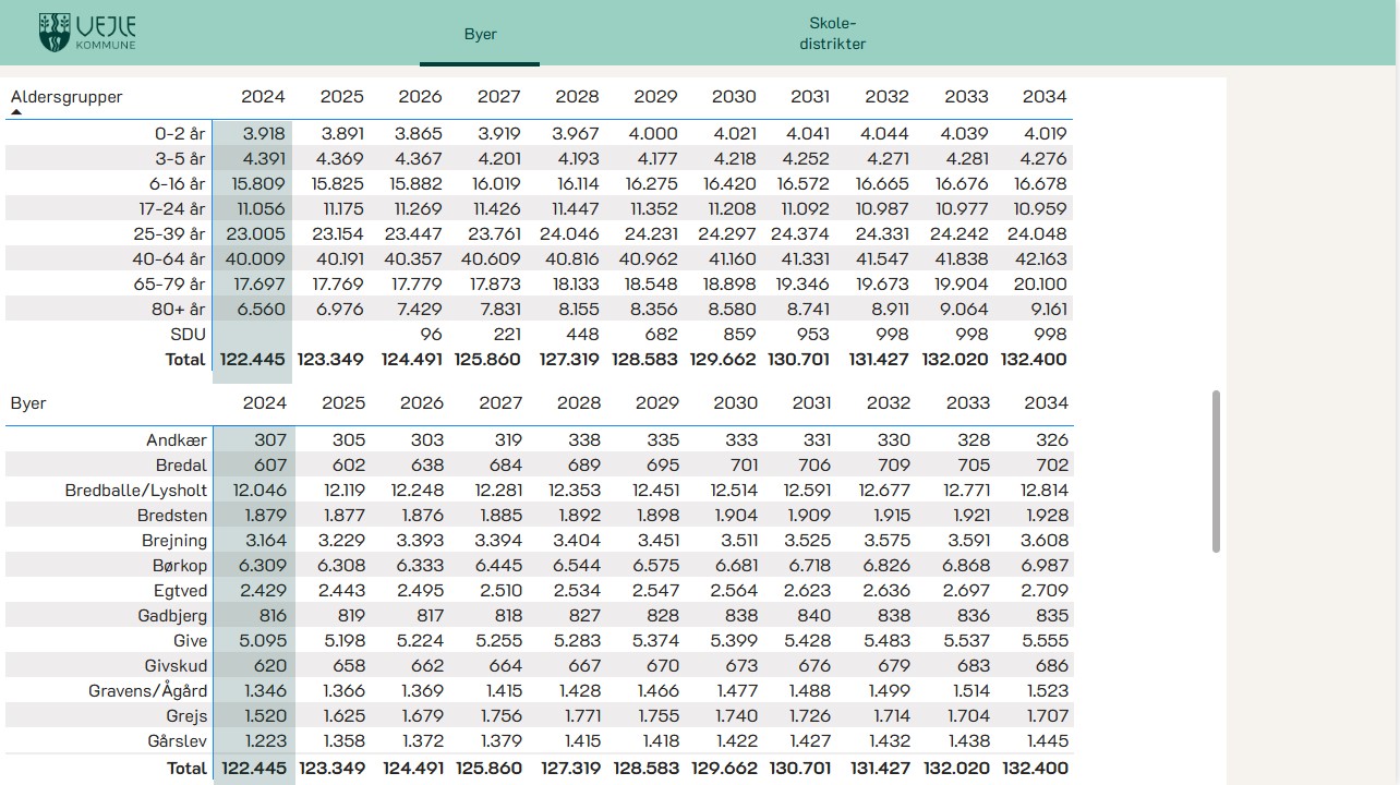Du kan se befolkningsprognosen 2026-2035 opdelt på skoledistrikter og byniveau. Vælg selv, om du vil se prognosen grafisk eller som tabel.