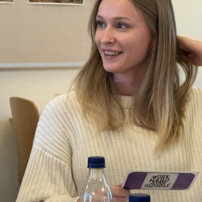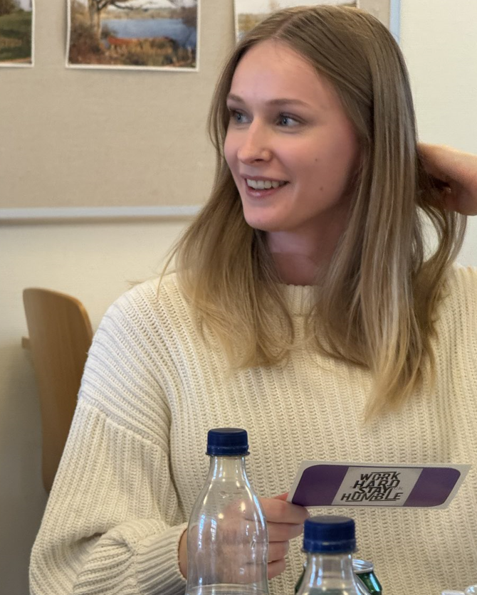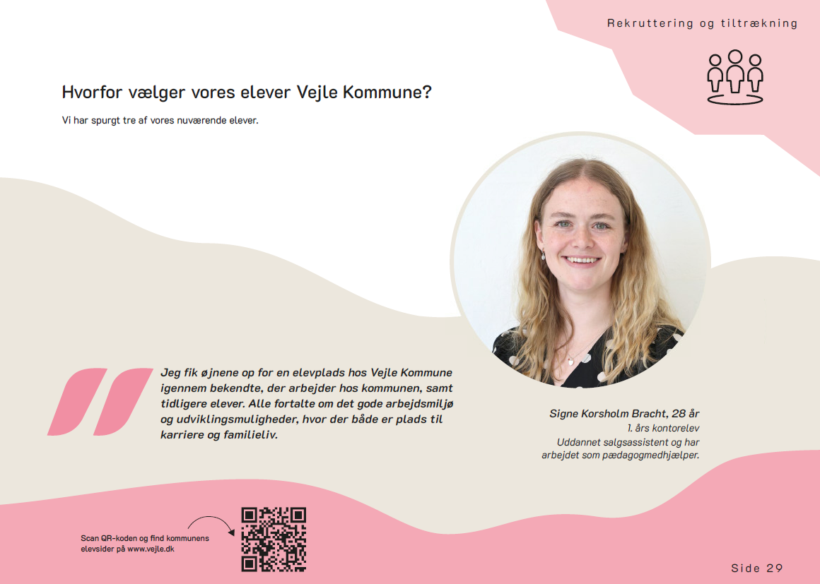 Signe, udlært august 2025 - var elev i Regnskab og på andet år i Sundhed & Forebyggelse. Hun har valgt at holde en pause og har planer om at søge tilbage til Vejle Kommune i 2026