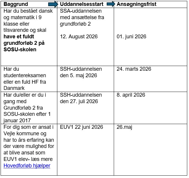 • Du går på grundforløb 1 eller 2 på SOSU-skolen - vedhæft dokumentation herfor i din ansøgning til Vejle Kommune