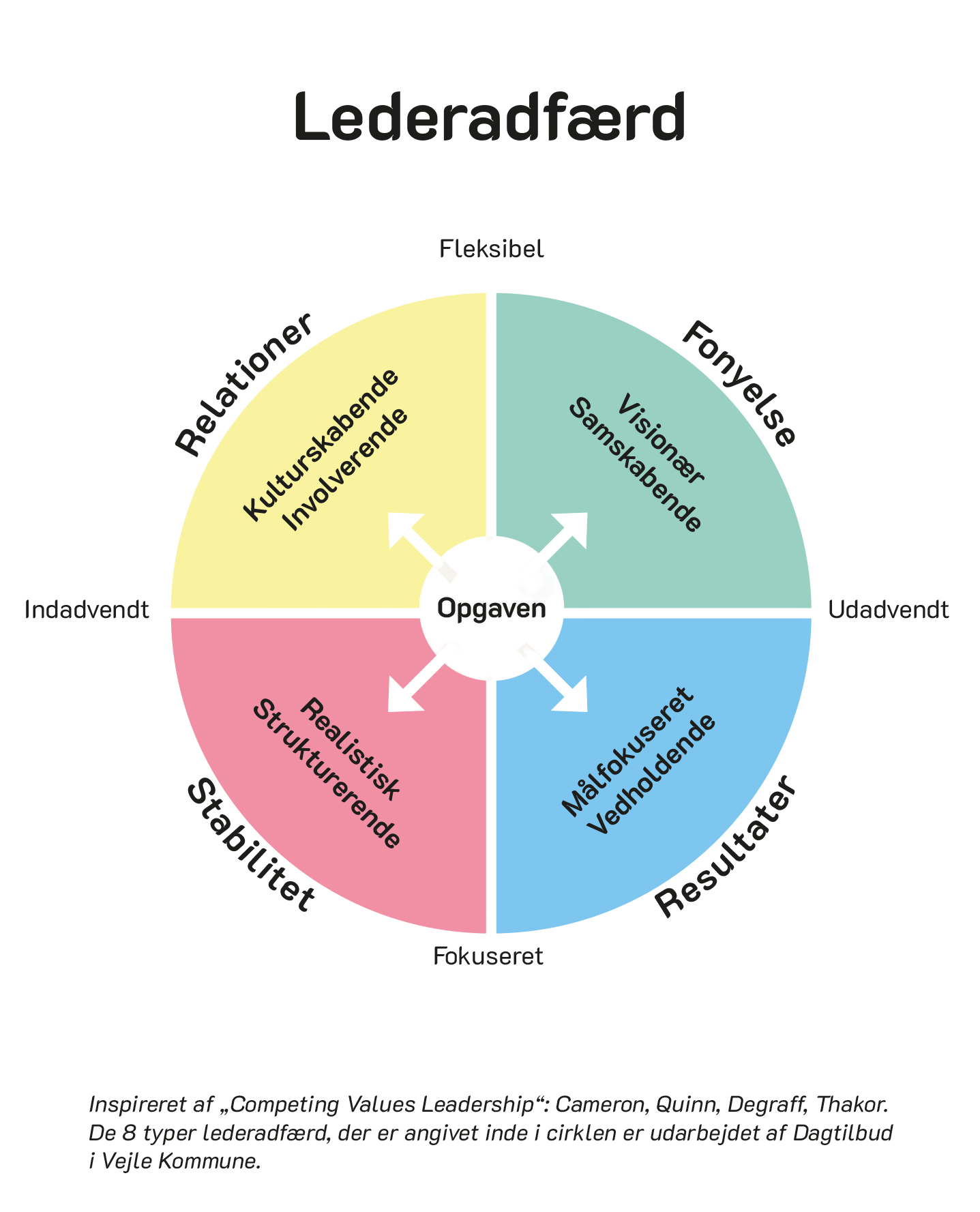Som fundament for ledelsesgrundlaget benyttes den evidensbaserede og international anerkendte organisationsmodel "Competing Values Framework". Modellens pointe er, at enhver organisation skal balancere i et indadrettet (ind i egen organisation) og udadrettet fokus (ud i samfundet og mod kunder/borgere). Samtidig skal der balanceres mellem at være fleksibel (nytænkende og forandringsparat) og fokuseret (stabilitetssøgende). Sammenholdt giver disse dimensioner fire hovedområder, dagtilbuddet skal lykkes med at balancere for at skabe høj kvalitet i opgaveløsningen og god trivsel: Relationer, Fornyelse, Resultater og Stabilitet.