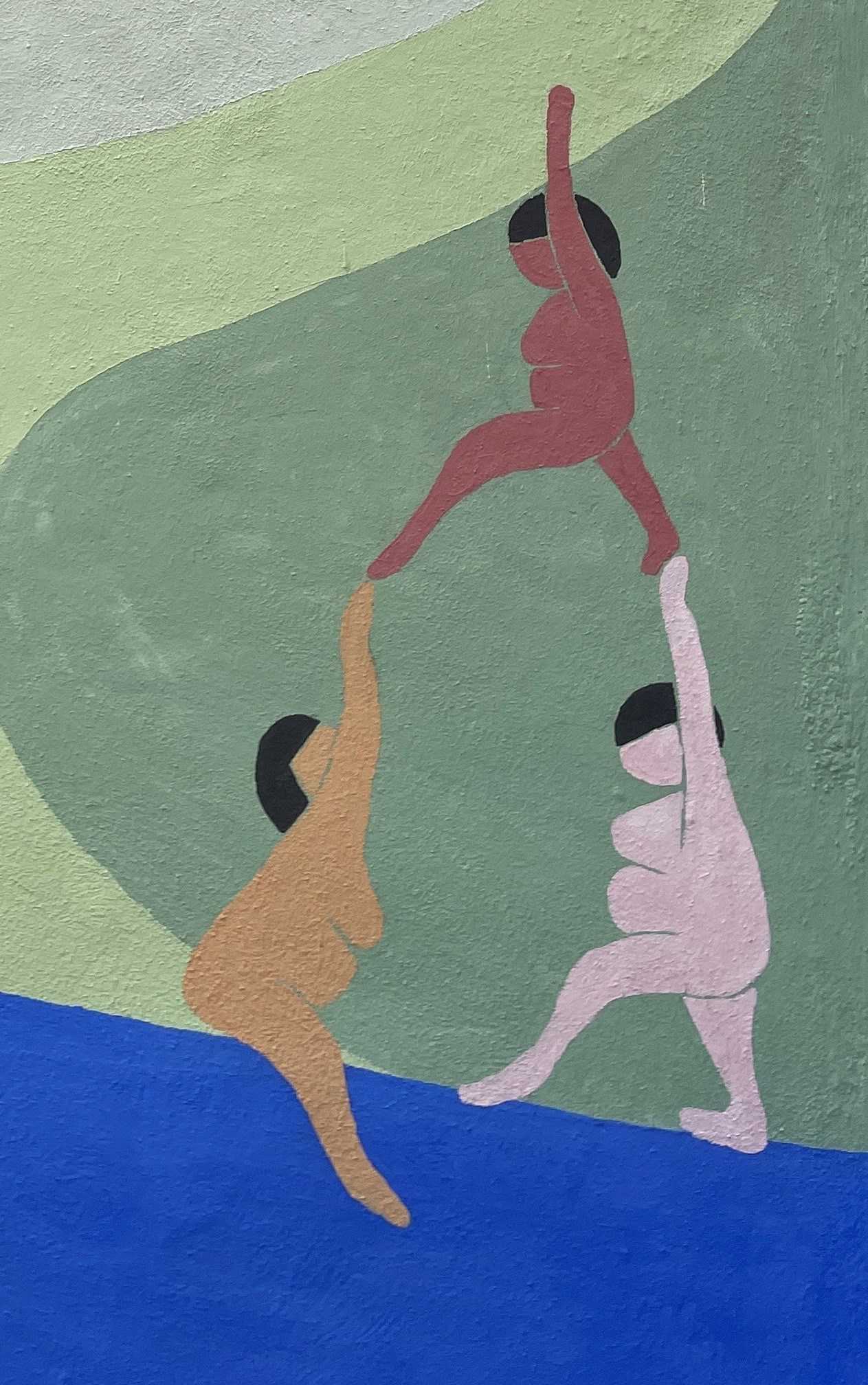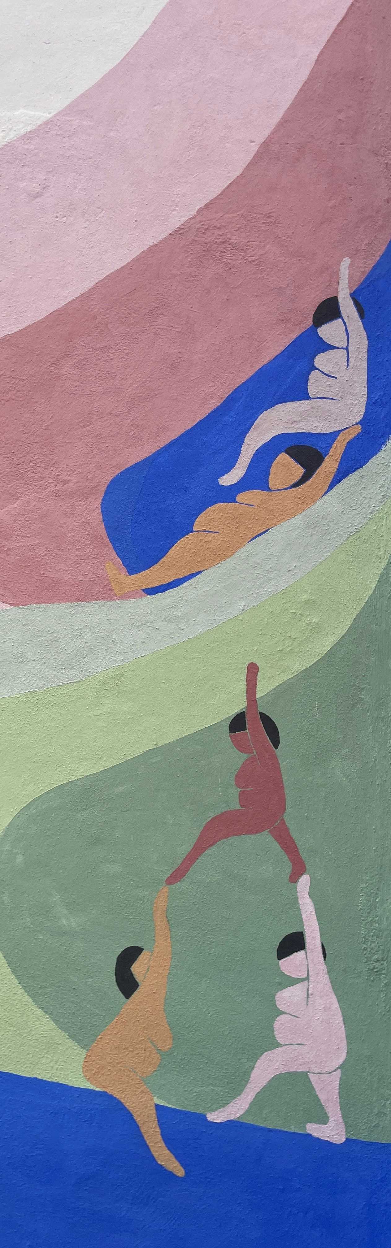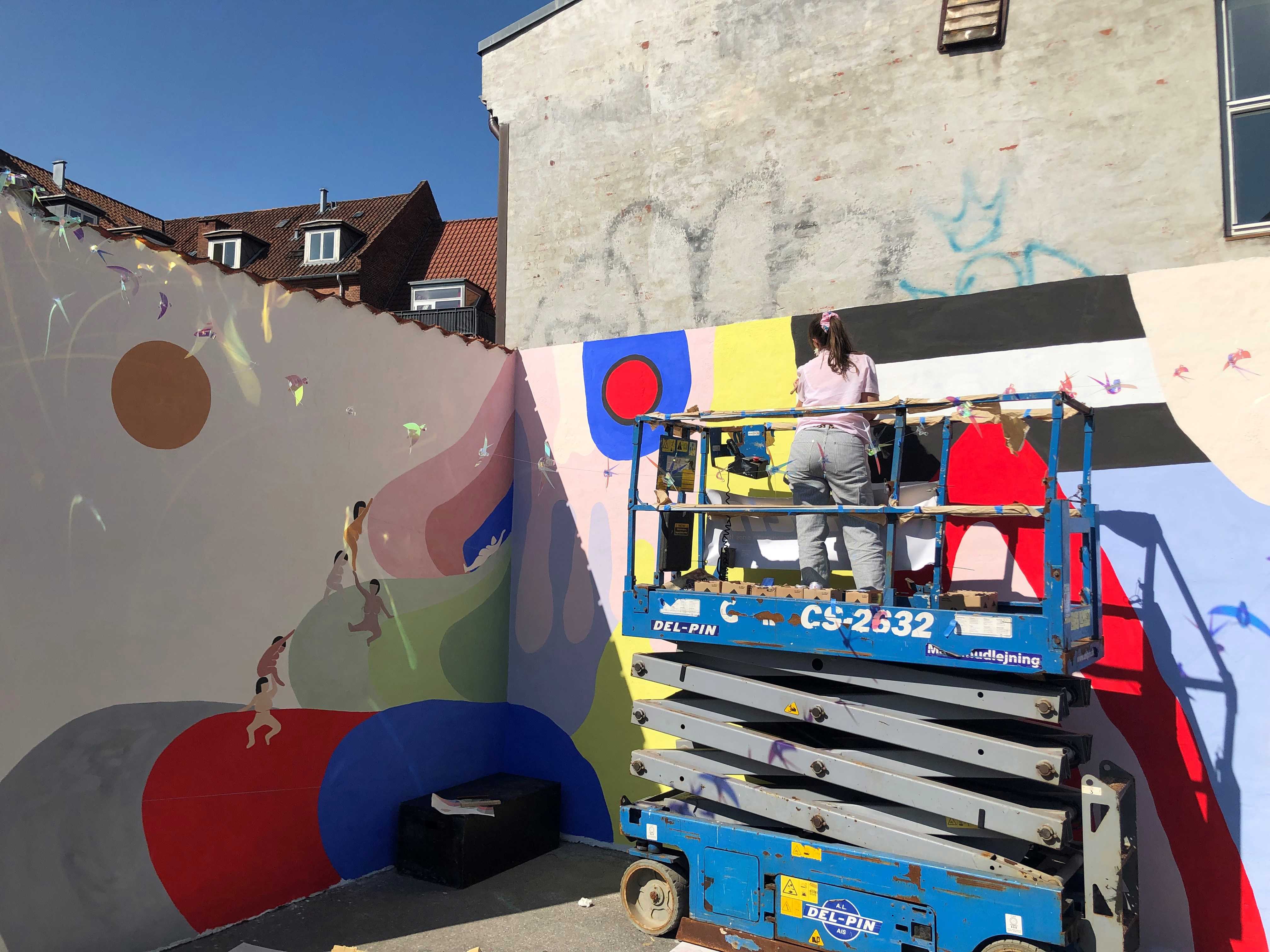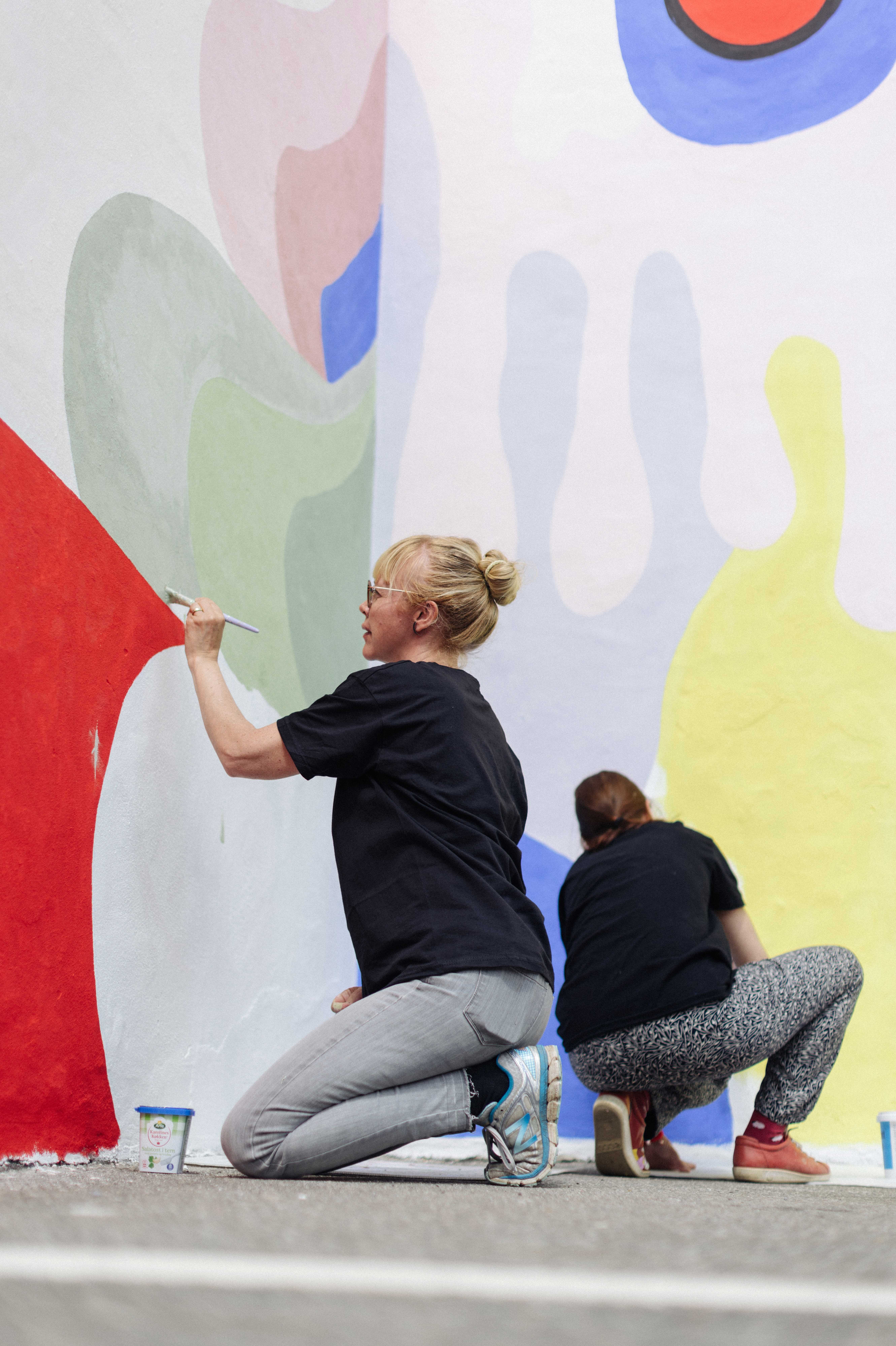 Vi er to kunstnere der er gået sammen om at male dette hjørne. Vi vil samarbejde ved at anvende farver fra hinandens paletter. Vi forventer også at låne elementer fra hinandens kunstværk. Vi ønsker at bidrage til fællesskabet gennem samarbejde - vi ønsker at bygge hinanden op.