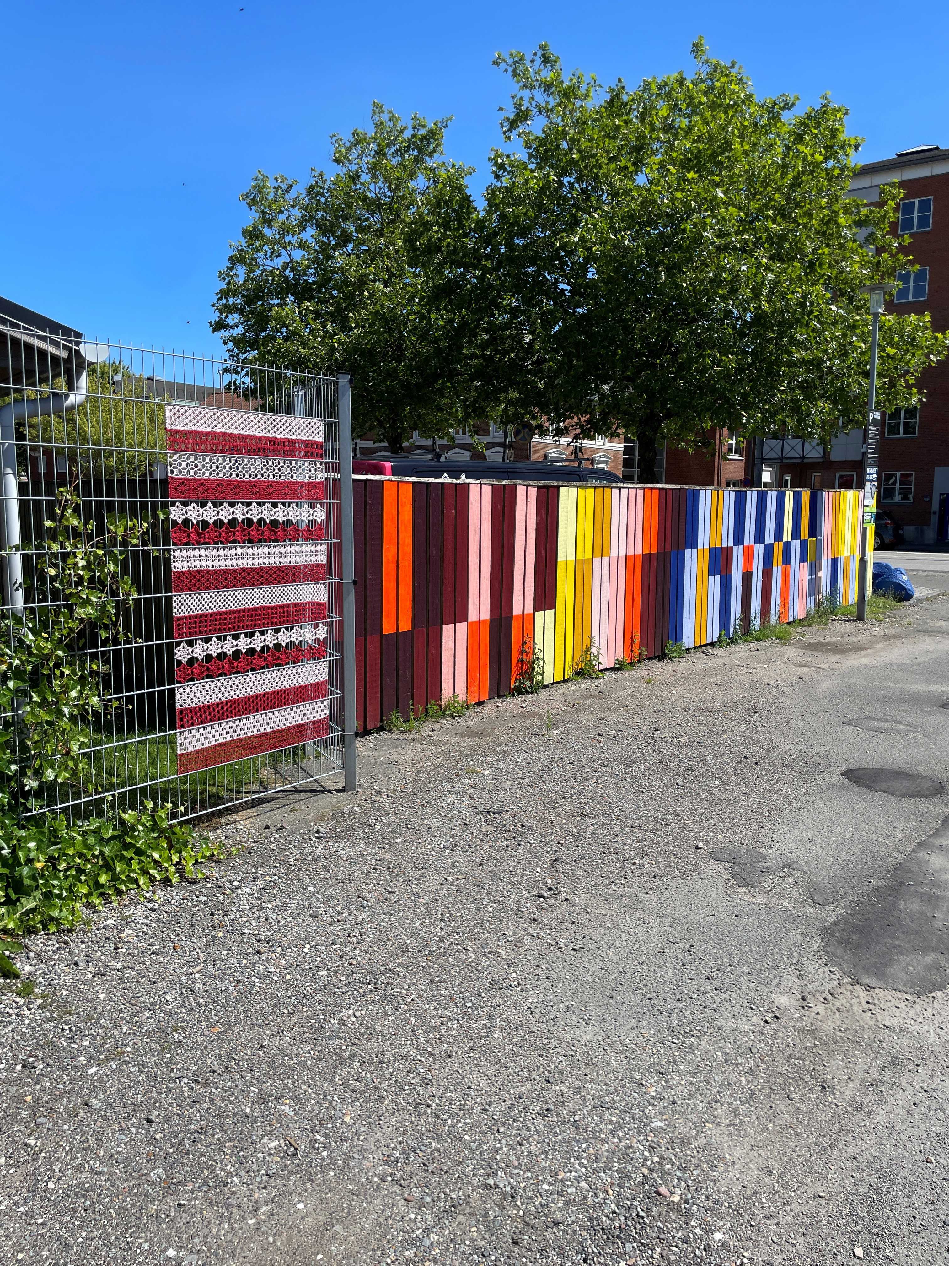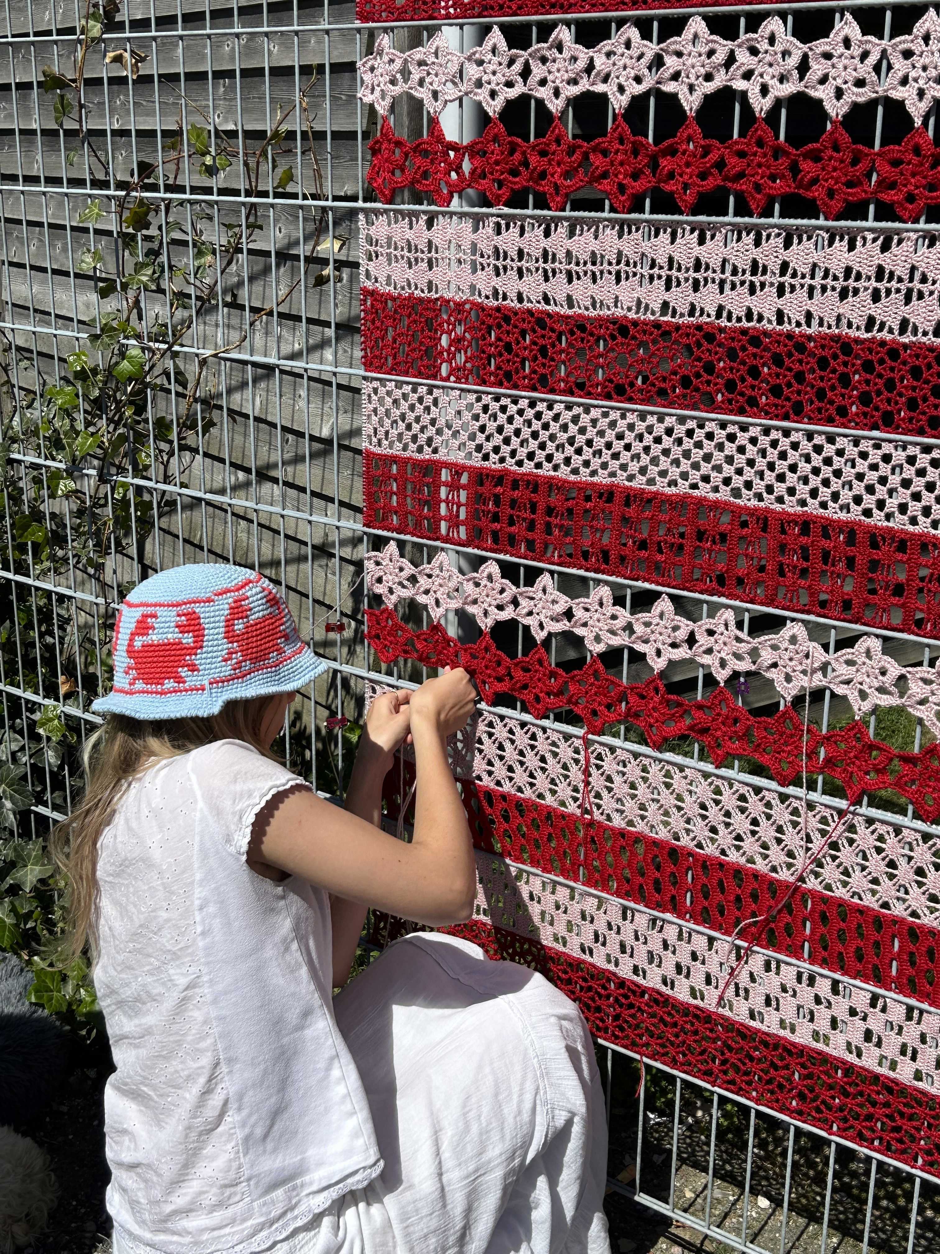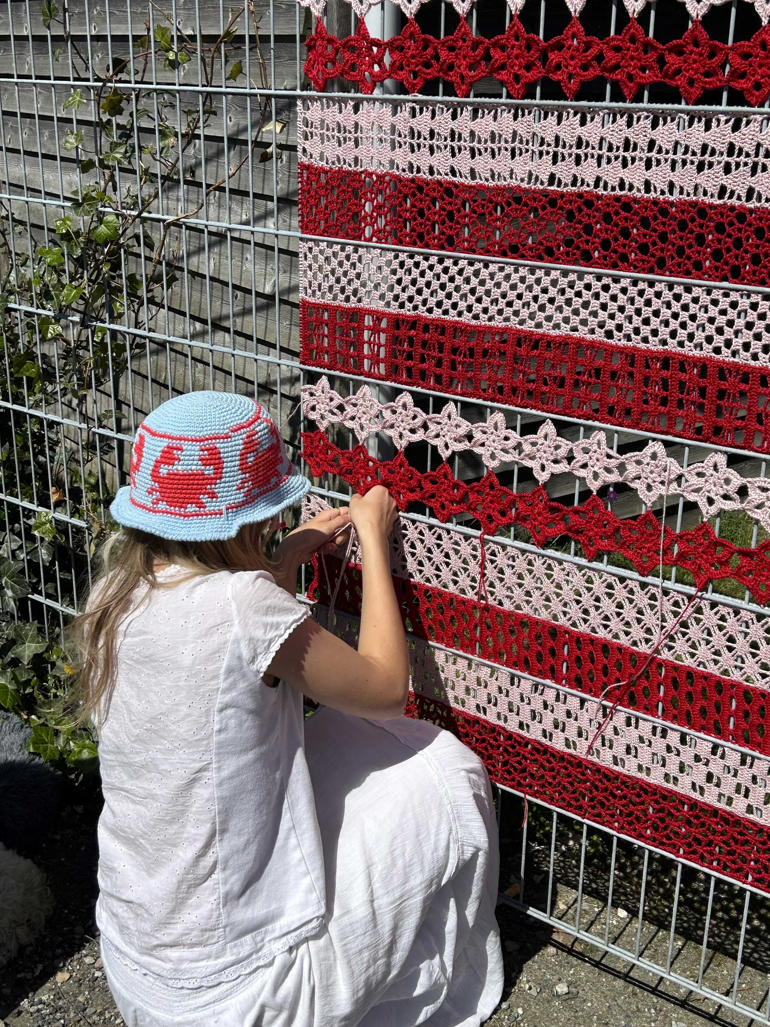 Oplev Dina Leas hæklede værk på Dæmningen i Vejle – 16 unikke paneler skabt af garn fra genanvendt plast, hvor bæredygtighed møder kreativitet.