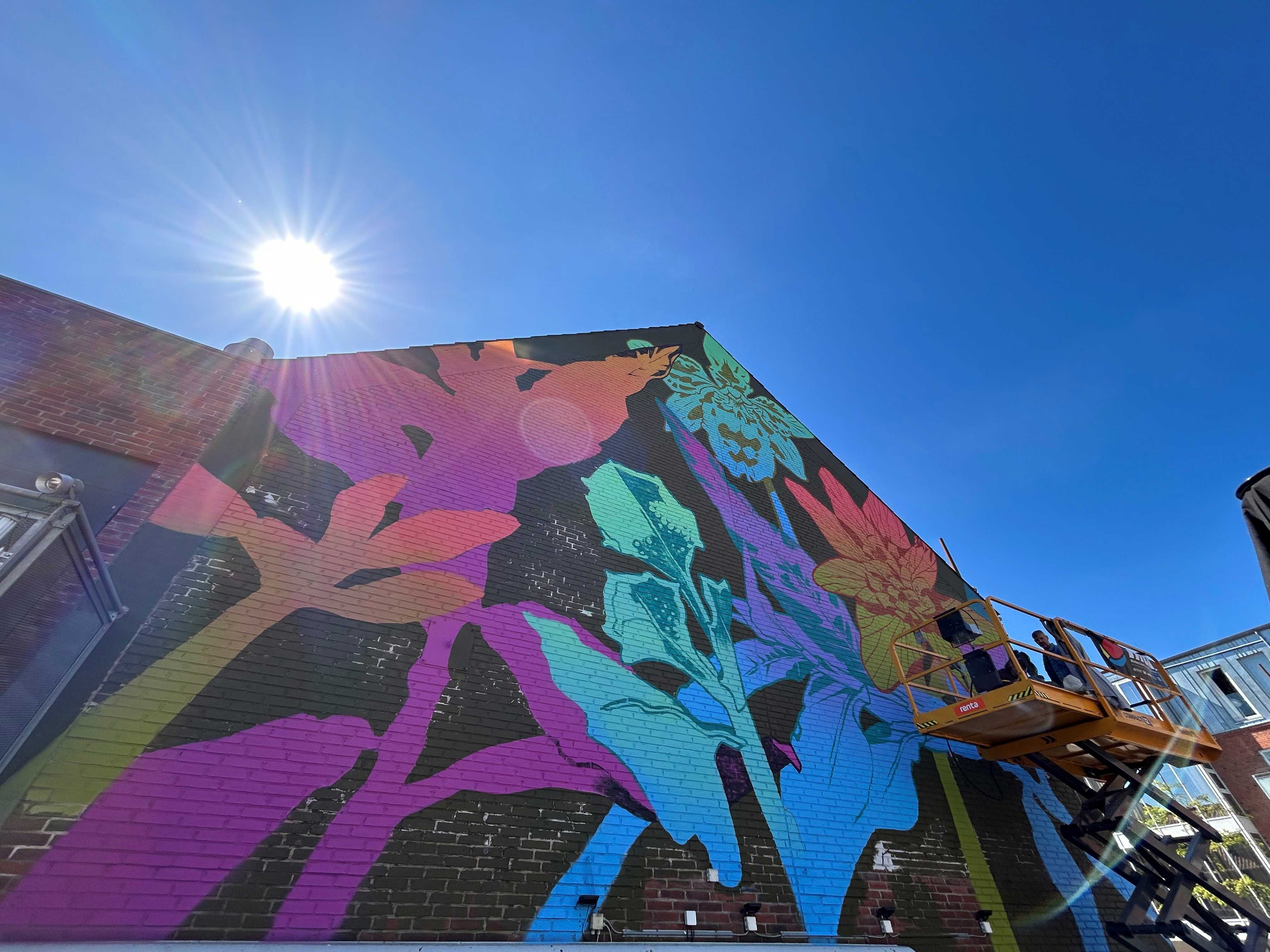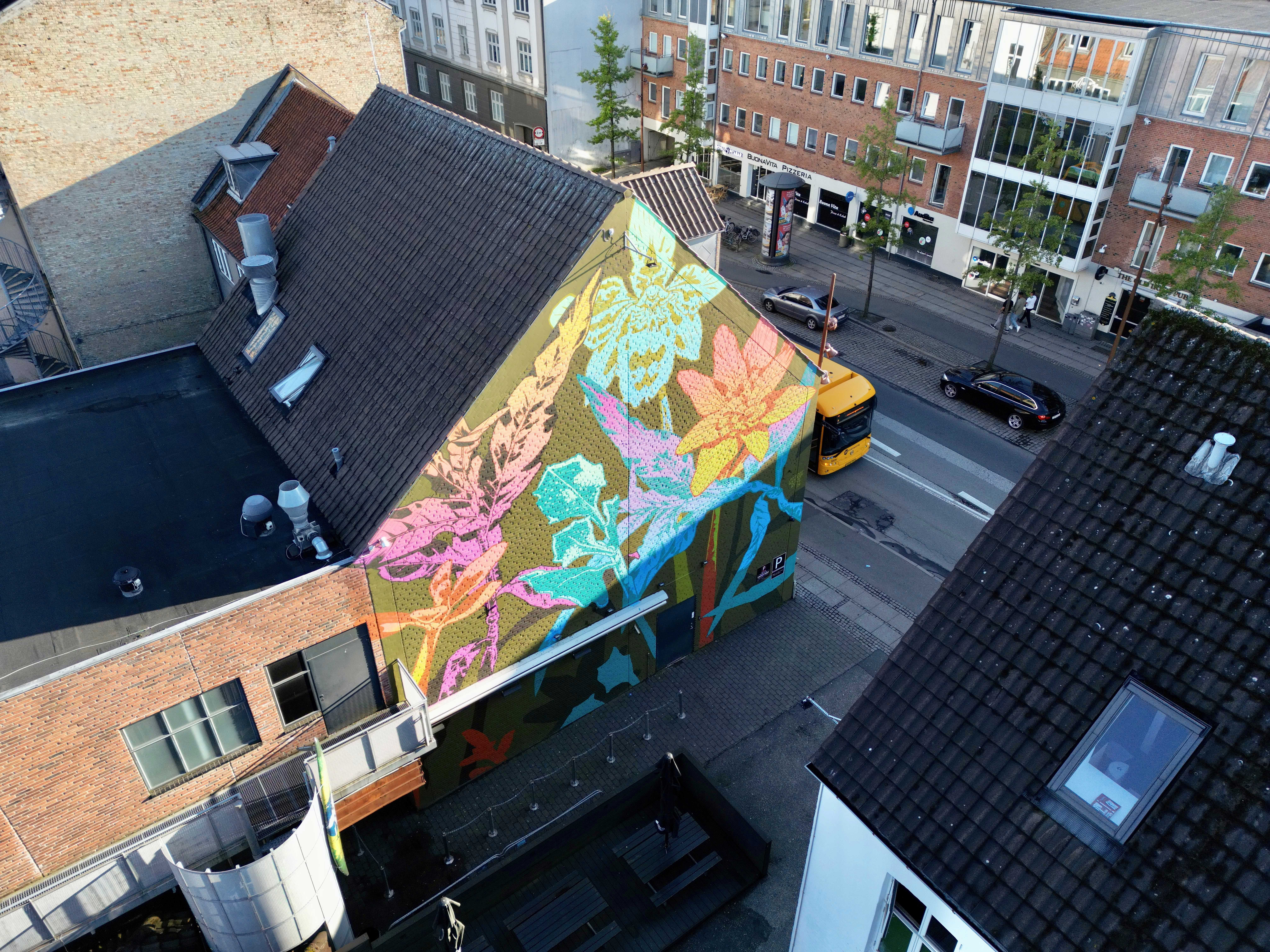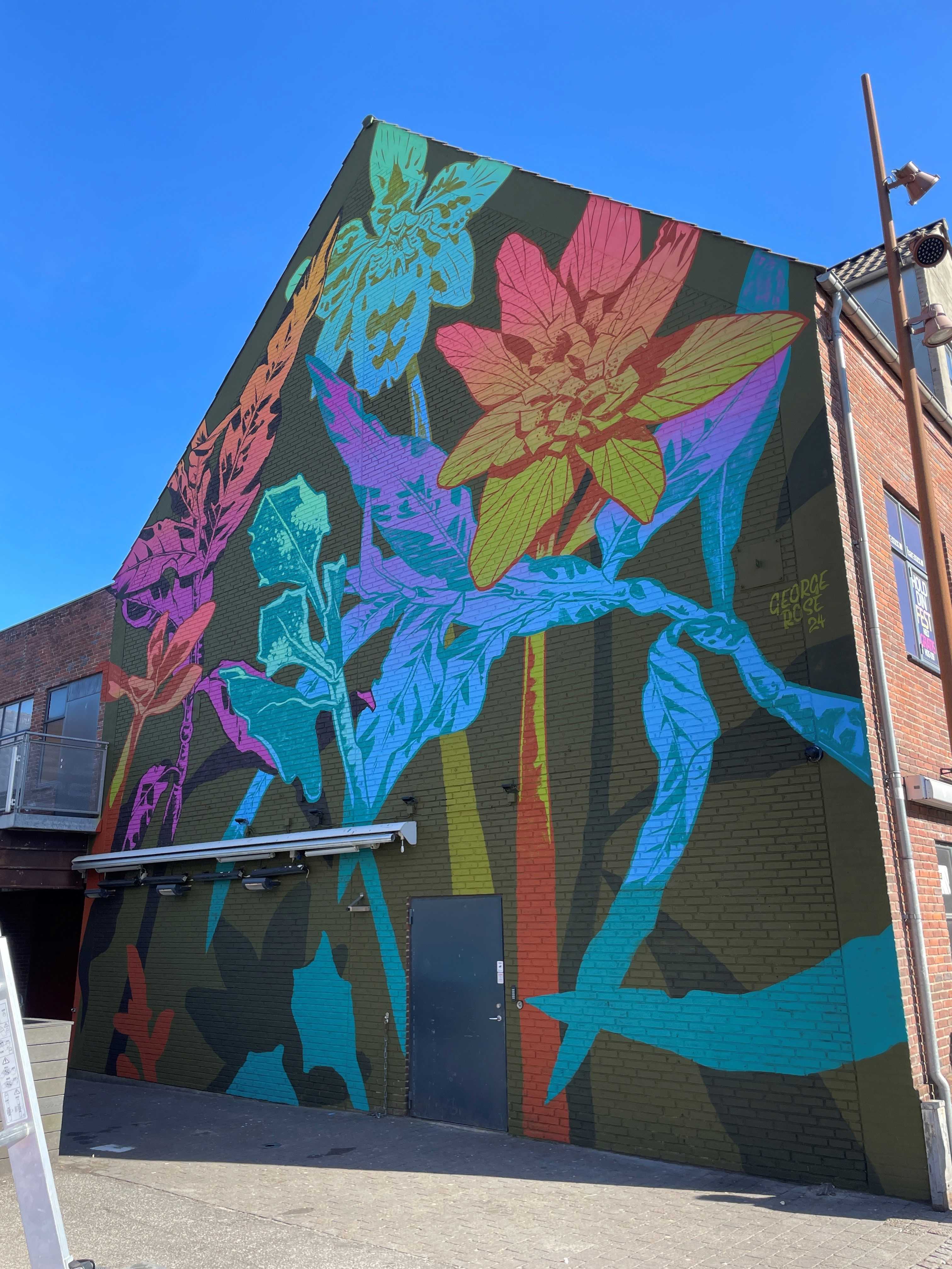 Oplev George Roses betagende vægmaleri på Dæmningen 38 i Vejle. En australsk kunstner, der forener botaniske elementer og tidens kontinuitet i storskalaværk.