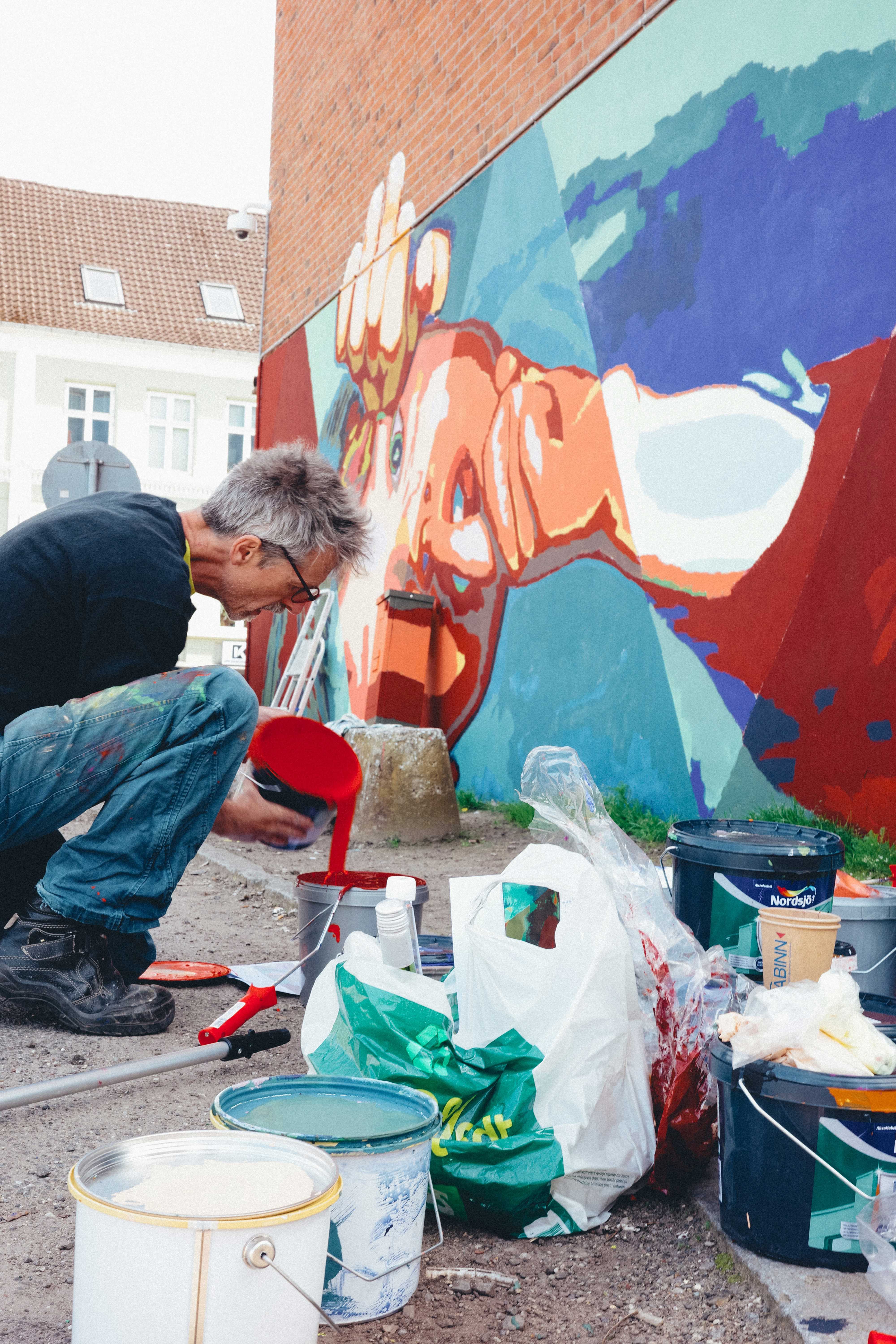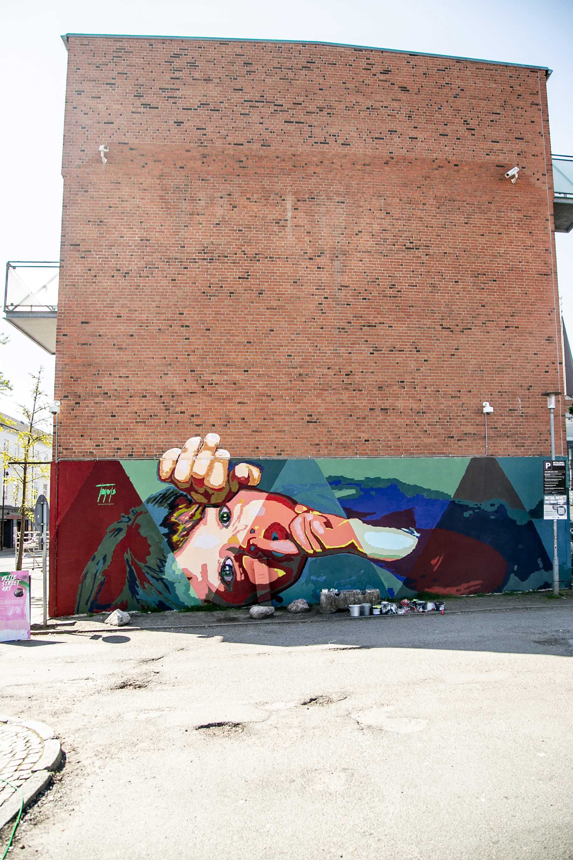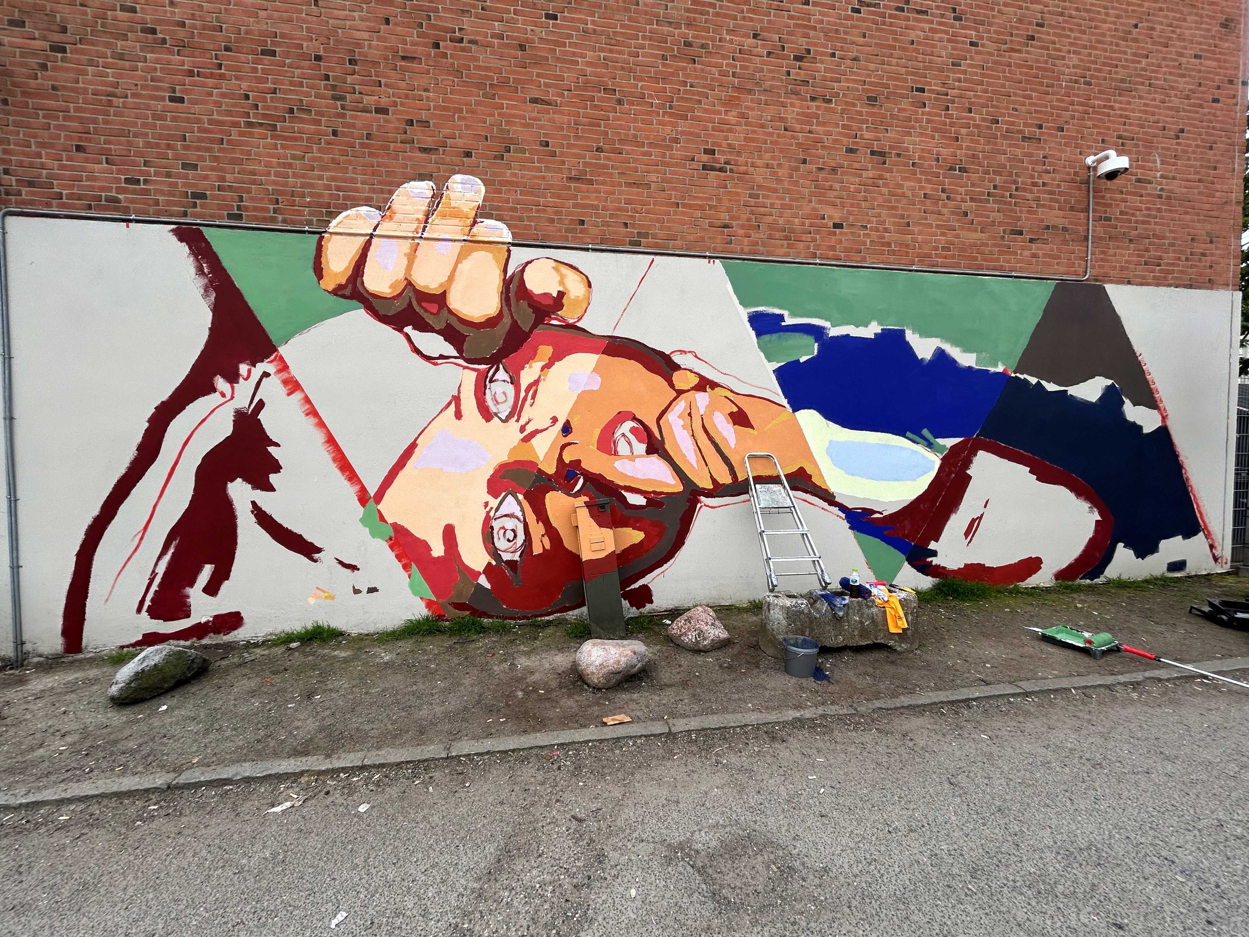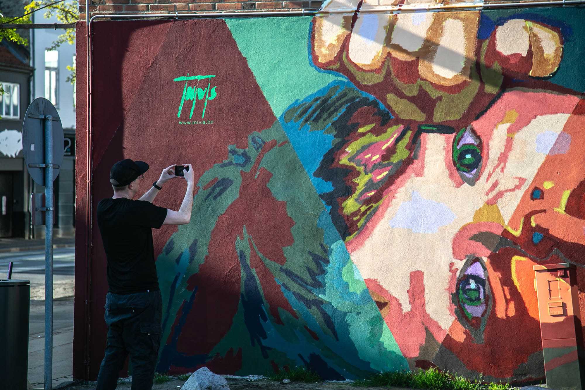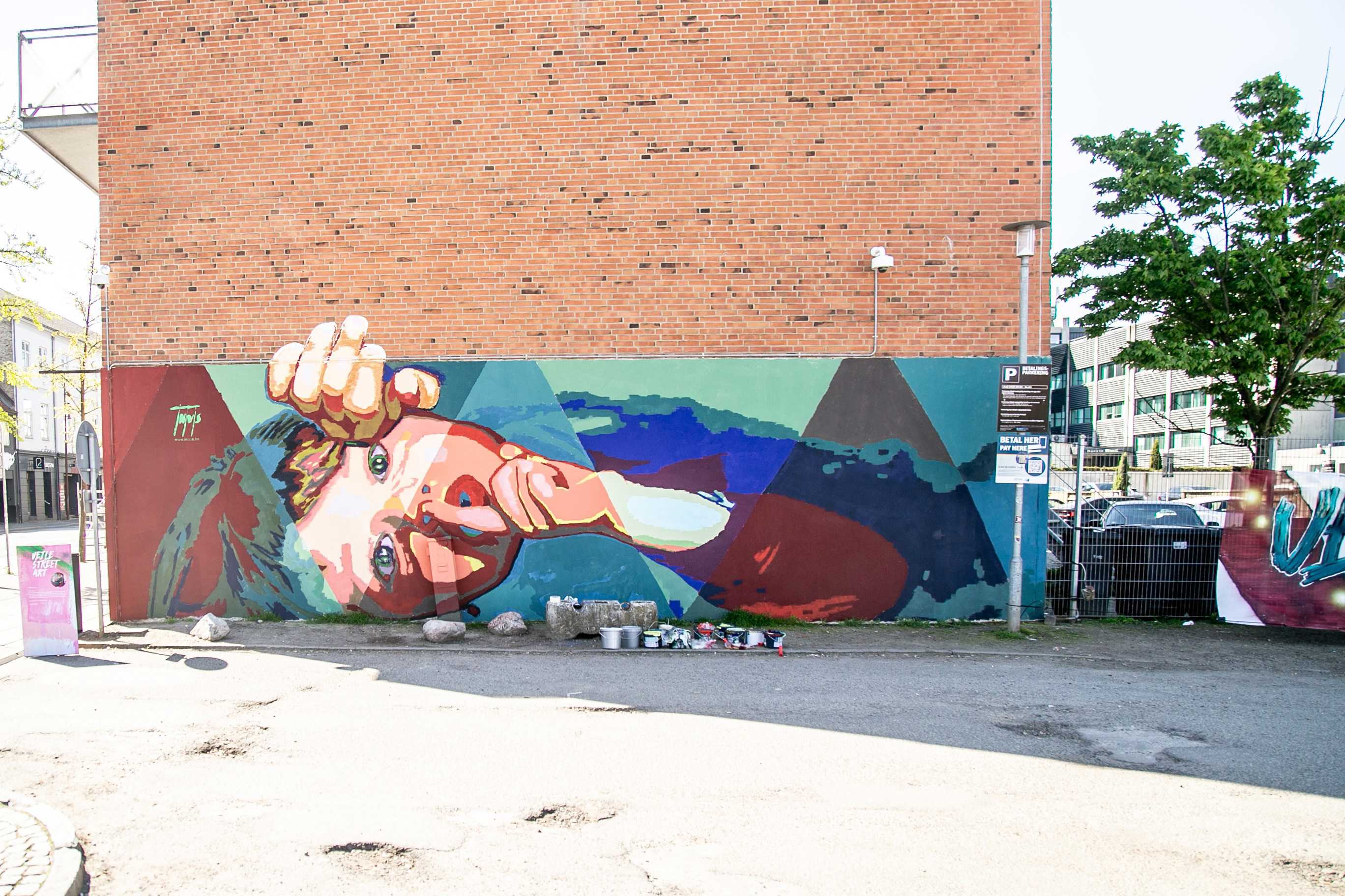 Oplev Intvis' dynamiske og farverige kunst på gavlen på Dæmningen 19A i Vejle. En anerkendt kunstner, der med sine dristige geometriske former og levende farver skaber et tankevækkende værk i byens rum.