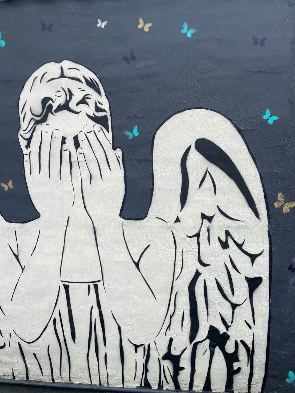Værket er lavet i en mash-up graffiti stil med spraymaling og stencil.