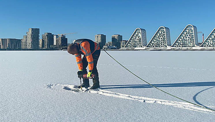 - I perioder med vedvarende frost måler vi dagligt isens tykkelse på det samme sted på ni forskellige søer samt inderst i Vejle Fjord.