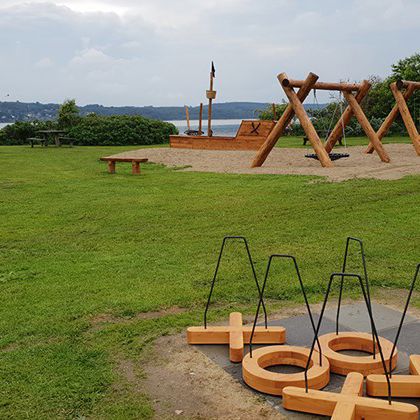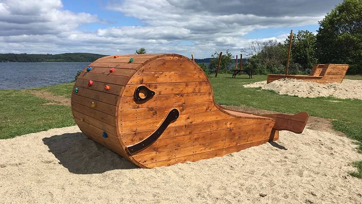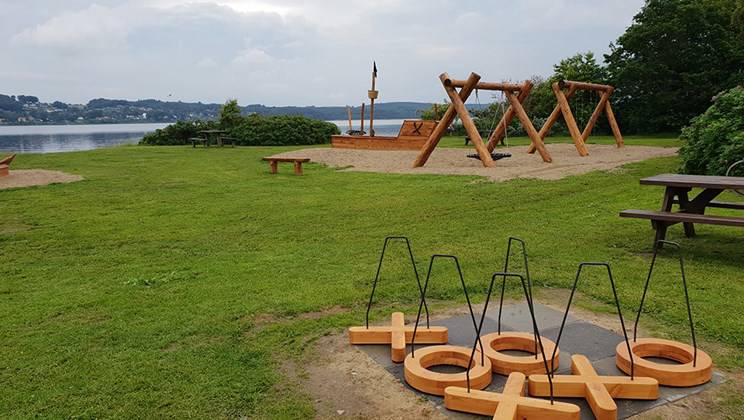 På stranden er der en rampe til kiosken og til handicaptoilettet, en stenmel-sti helt ud til stensætningen ved vandet og borde i rette højde.