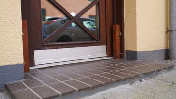 Her et eksempel på, hvordan en ejendom forsøger at forebygge oversvømmelser ved at montere holdere til vandtætte skotter, der let og hurtigt man monteres for at holde vandet ude.
