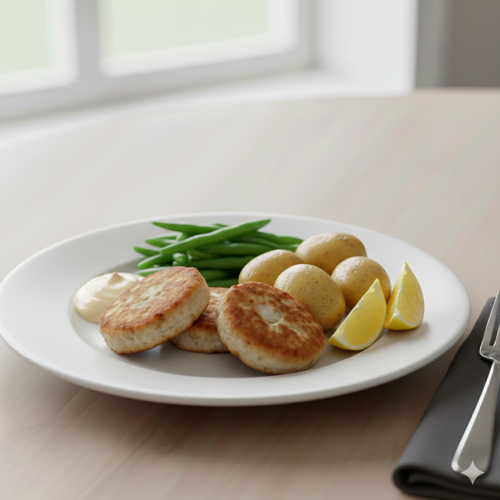Fiskefrikadeller med remoulade, kartofler og grønne bønner