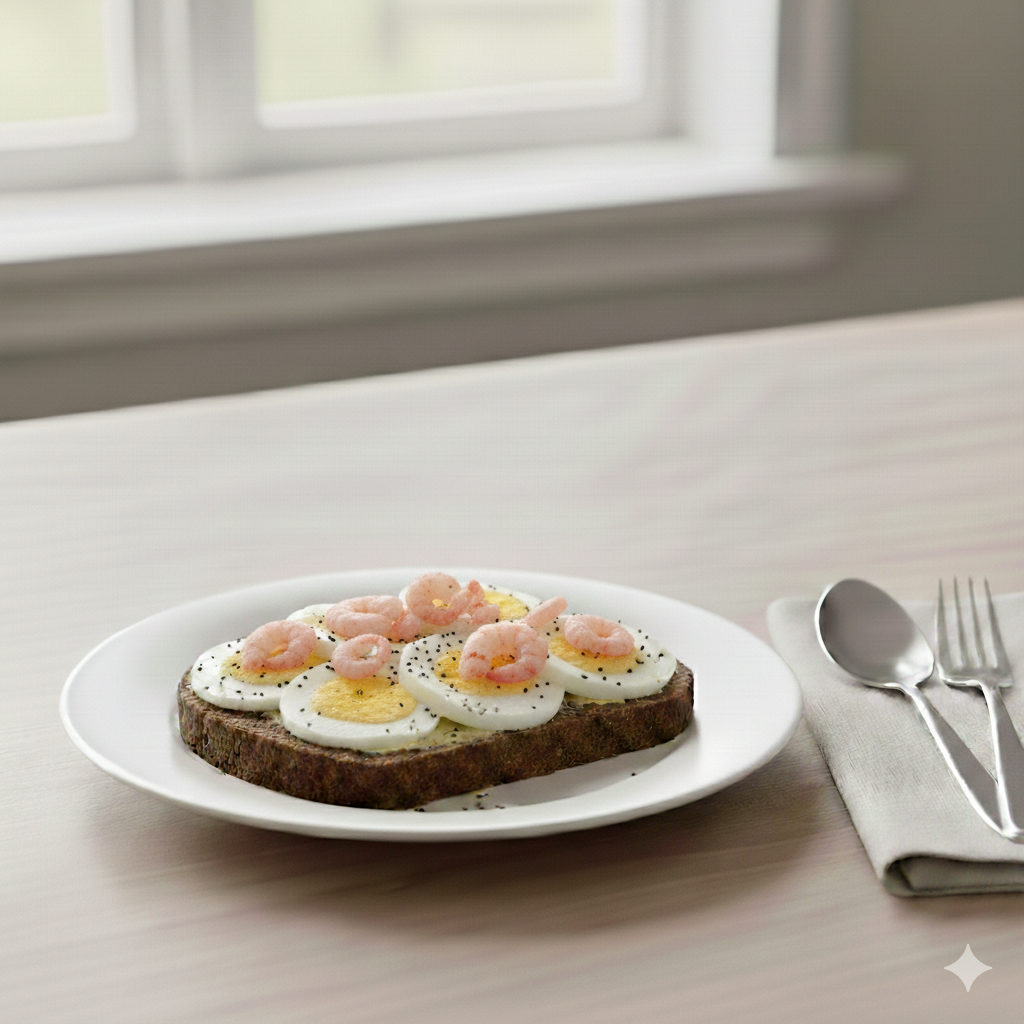 - Del æg i skiver og anret på rugbrød med rejer, mayonnaise, salt og peber.