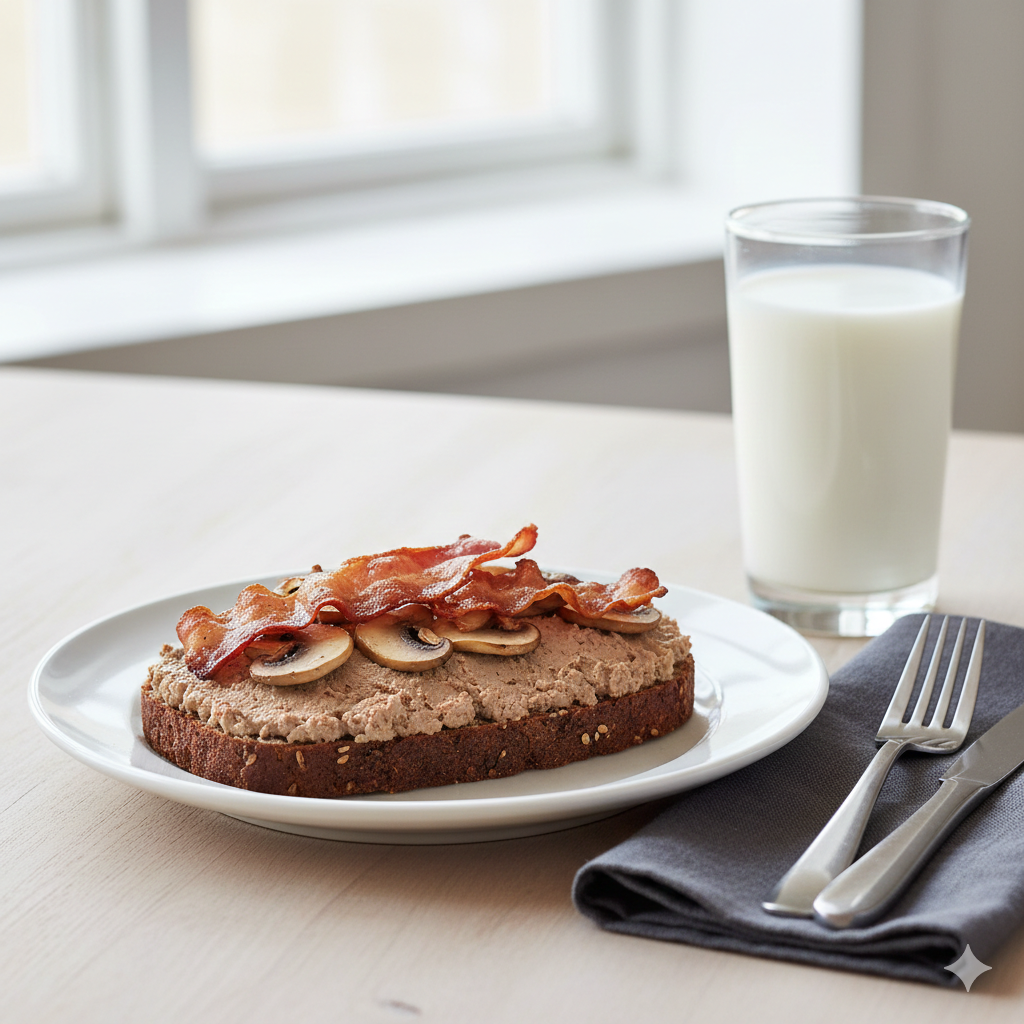 - Smør rugbrød med smør. Anret med leverpostej, champignon og bacon. Servér med et glas mælk hertil.