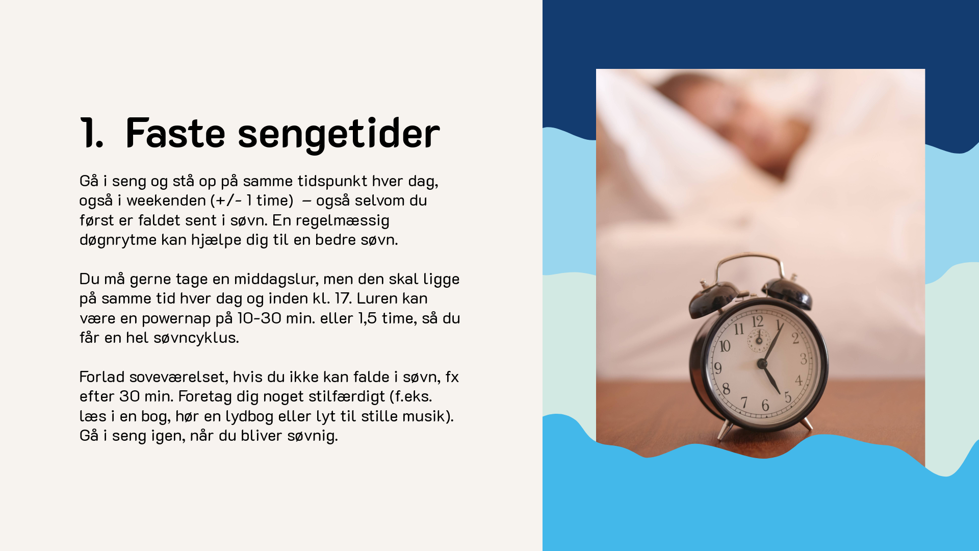 - Give dig viden om gode vaner inden sengetid og konkrete tiltag, der kan være med til at forbedre din søvn.
