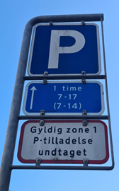 Det fremgår af skiltet, at køretøjer med tilladelse til parkering i zone 1 er undtaget fra tidsbegrænsningen.