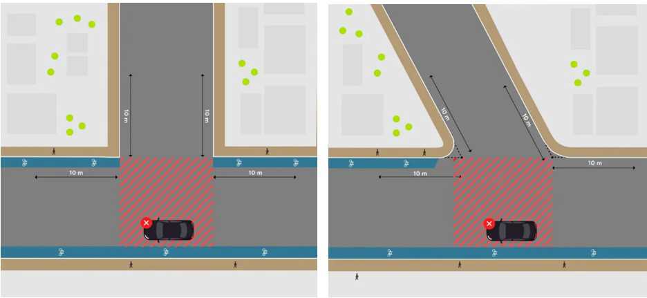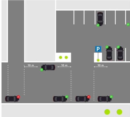 Det er ikke tilladt at standse eller parkere et køretøj i et vejkryds, direkte over for vejkrydset i et T-kryds eller inden for ti meter fra et vejkryds.