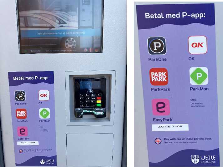 Betaling kan ske i en parkeringsautomat eller betalingsapp. Det fremgår af parkeringsautomater eller skiltning, hvilke parkeringsapps der kan anvendes til betaling.