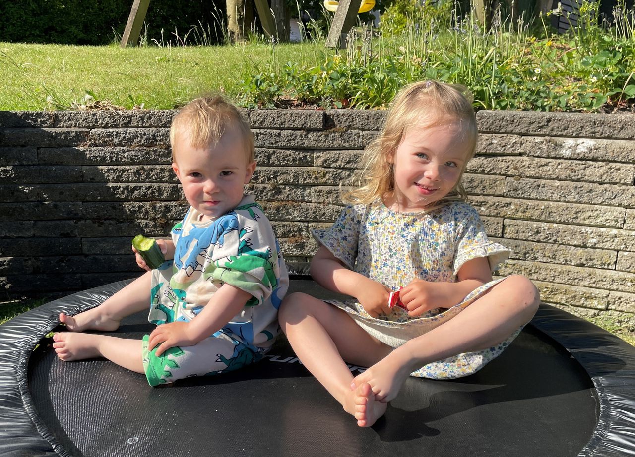 Esther and August have taken over the garden, with swings, a trampoline and plenty of grass to run around on.